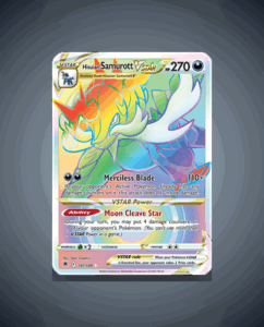 Hisuian Samurott VSTAR from the Astral Radiance set boasts a striking 270 HP, making it a resilient addition to any deck. This Rare Secret card features the ability Moon Cleave Star and the powerful attack Merciless Blade. Its sleek design and formidable stats make it…