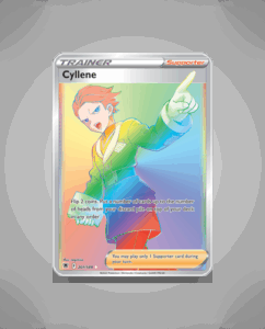 Cyllene is a Rare Rainbow card from the Astral Radiance set, numbered 201. Its vibrant design adds a unique touch to any collection. This card stands out for its striking visual appeal within the set.