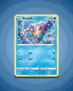 Bruxish from the Battle Styles set is an uncommon card numbered 43. It features 110 HP and a striking Surf attack. This vibrant Pokémon adds a splash of energy to any collection.