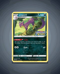 Liepard from the SWSH Black Star Promos set boasts a sleek design and 100 HP, making it a sturdy choice in battle. This Promo rarity card features the ability Trade, allowing strategic hand management. Its attack, Slash, provides a straightforward offensive option for players.