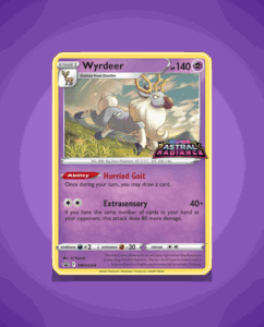 Wyrdeer from the SWSH Black Star Promos set boasts 140 HP and features the unique ability Hurried Gait. Its attack, Extrasensory, adds strategic depth to gameplay. This Promo rarity card stands out with its sleek design and solid stats.