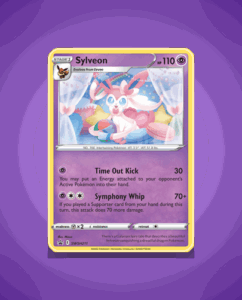Sylveon from the SWSH Black Star Promos set is a Promo rarity card featuring 110 HP. This elegant Pokémon uses the attack Symphony Whip to engage opponents. Its sleek design makes it a notable addition to any collection.