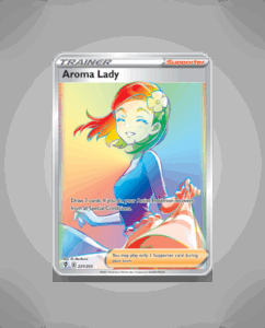 Aroma Lady from the Evolving Skies set is a Rare Rainbow card that stands out with its vibrant design. As card number 221, it adds a unique flair to any collection. This card’s striking appearance makes it a notable piece for enthusiasts of the set.
