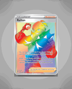 Raihan from the Evolving Skies set is a Rare Rainbow card, numbered 224. This striking card stands out with its vibrant design and rarity. It is a notable addition for collectors focusing on unique and colorful cards.