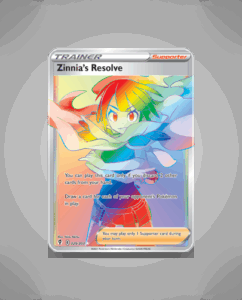Zinnia’s Resolve is a Rare Rainbow card from the Evolving Skies set, numbered 225. Its vivid artwork captures the determined spirit of Zinnia, making it a distinctive addition for collectors. This card stands out for its rarity and striking design within the set.