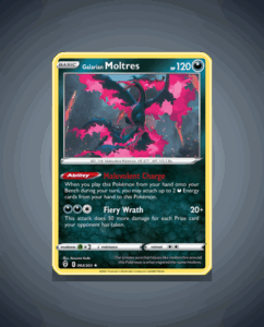 Galarian Moltres from the Evolving Skies set is a Rare Holo card numbered 93. This striking Pokémon boasts 120 HP and features the ability Malevolent Charge. Its attack, Fiery Wrath, adds a dynamic edge to gameplay.