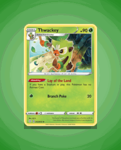 Thwackey from the Shining Fates set is an Uncommon card with 90 HP. It features the ability Lay of the Land and the attack Branch Poké. This lively Pokémon is numbered 12 in the set.