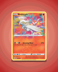 Reshiram from the Shining Fates set is an Amazing Rare card numbered 17. This striking card features 120 HP and the powerful attack Amazing Blaze. Its vivid design makes it a notable addition for collectors.