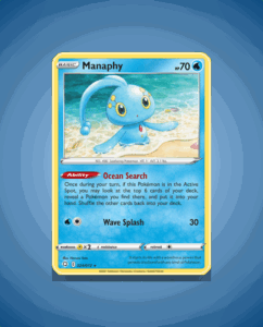 Manaphy from the Shining Fates set is a rare card numbered 24 with 70 HP. It features the ability Ocean Search and the attack Wave Splash, offering a unique tactical edge. This card’s design captures Manaphy’s aquatic essence with vivid detail.