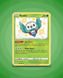 Rowlet from the Shining Fates Shiny Vault set is a Rare Shiny card numbered SV001. This vibrant card features 50 HP and the unique ability Sky Circus. Its attack, Wind Shard, complements its agile nature perfectly.