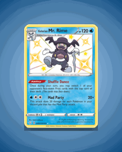 Galarian Mr. Rime from the Shining Fates Shiny Vault set is a Rare Shiny card with 120 HP. Its ability, Shuffle Dance, offers strategic versatility, while the Mad Party attack adds dynamic gameplay options. This card is numbered SV021, making it a distinctive addition to…