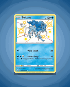 Suicune from the Shining Fates Shiny Vault set is a Rare Shiny card numbered SV022. It boasts a vibrant 120 HP and features the striking attack Aurora Loop. This card captures Suicune’s elegant presence with a shimmering design.