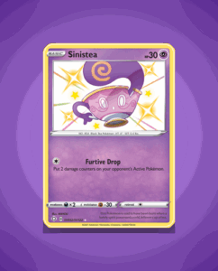 Sinistea from the Shining Fates Shiny Vault set is a Rare Shiny card numbered SV052. This petite Pokémon has 30 HP and features the attack Furtive Drop. Its shimmering appearance makes it a distinctive addition to any collection.