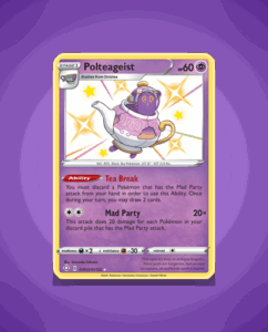 Polteageist from the Shining Fates Shiny Vault set is a Rare Shiny card with 60 HP. This intriguing Pokémon features the ability Tea Break and the attack Mad Party. Its unique design and moves make it a notable addition to any collection.