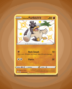 Galarian Farfetch’d from the Shining Fates Shiny Vault set is a Rare Shiny card numbered SV063. This vibrant card features 80 HP and a distinctive attack called Pierce. Its gleaming appearance makes it a notable addition for collectors.