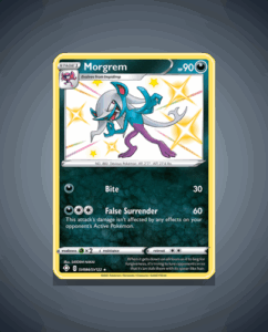 Morgrem from the Shining Fates Shiny Vault set is a Rare Shiny card numbered SV084. This card features 90 HP and a striking attack called False Surrender. Its vivid design makes it a notable addition for collectors seeking unique Pokémon cards.