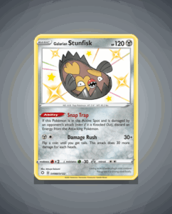 Galarian Stunfisk from the Shining Fates Shiny Vault set is a Rare Shiny card numbered SV088. It boasts 120 HP and features the ability Snap Trap, adding strategic depth to gameplay. Its attack, Damage Rush, offers a dynamic option for battling opponents. This card stands…