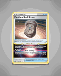 Earthen Seal Stone is a Rare Holo card from the Silver Tempest set, numbered 154. It features the attack Star Gravity, adding a dynamic element to gameplay. This card stands out with its distinctive design and strategic potential.