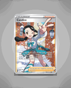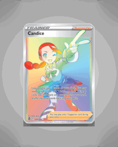 Candice is a Rare Rainbow card from the Silver Tempest set, numbered 204. This vibrant card captures the essence of the character with striking artwork. It holds a special place for collectors seeking unique and colorful additions.