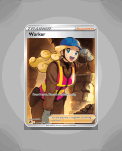 Worker is a Rare Ultra card from the Silver Tempest set, numbered 195. Its design reflects the dynamic energy of the set. This card adds a distinctive presence to any collection.