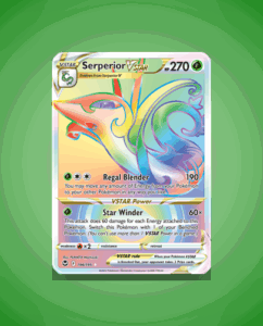 Serperior VSTAR is a Rare Rainbow card from the Silver Tempest set, numbered 196. This striking card boasts 270 HP and features the powerful attack Regal Blender. Its vibrant design makes it a notable addition for collectors.