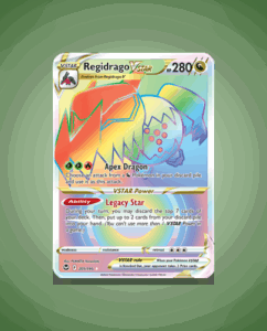 Regidrago VSTAR from the Silver Tempest set boasts a striking Rare Rainbow rarity and a robust 280 HP. Its Legacy Star ability and powerful Apex Dragon attack make it a notable addition for collectors and players alike. This card is numbered 201 in the set…