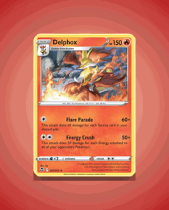 Delphox from the Silver Tempest set is a rare card boasting 150 HP. This fiery Pokémon features the dynamic attack Flare Parade. Its vibrant presence makes it a notable addition to any collection.