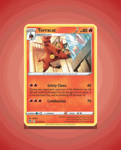 Torracat from the Silver Tempest set is an uncommon Pokémon card numbered 31. It features 80 HP and a single attack called Combustion. This card offers a straightforward addition to any collection with its vibrant design.