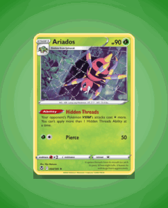 Ariados from the Silver Tempest set is a Rare Holo card featuring 90 HP. It boasts the intriguing ability Hidden Threads and the attack Pierce, making it a distinctive addition to any collection. This card is numbered 4 in the set.