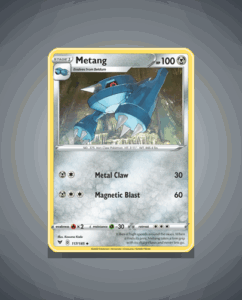 Metang from the Vivid Voltage set is an Uncommon Pokémon card numbered 117. It boasts a sturdy 100 HP and features the dynamic attack Magnetic Blast. This card offers a solid addition to any collection with its vibrant design and strategic potential.