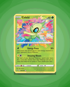 Celebi from the Vivid Voltage set is an Amazing Rare card numbered 9. This lively Pokémon has 60 HP and features the attack Energy Press. Its vibrant design makes it a notable addition to any collection.