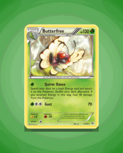 Butterfree from the Flashfire set is a rare card numbered 3 with 130 HP. It features the attack Gust, showcasing its swift aerial prowess. This card offers a vibrant addition to any collection.