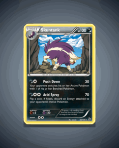 Skuntank from the Flashfire set is a rare Pokémon card numbered 55. It features a solid 100 HP and a striking Acid Spray attack. This card offers a vibrant addition to any collection.