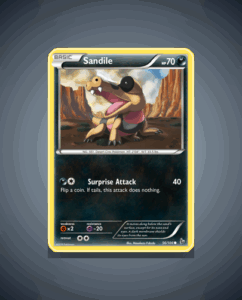 Sandile from the Flashfire set is a common Pokémon card numbered 56. It has 70 HP and features the attack Surprise Attack. This card offers a straightforward addition to any collection.