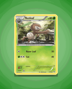 Nuzleaf from the Flashfire set is an uncommon card with 80 HP. This intriguing Pokémon features the attack Cut, offering straightforward gameplay options. As card number 6 in the set, it holds a distinct place for collectors and players alike.