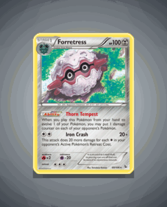 Forretress from the Flashfire set is a rare Pokémon card numbered 60 with 100 HP. It features the ability Thorn Tempest and the attack Iron Crash. This card offers a sturdy presence with its defensive and offensive options.