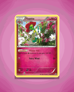 Floette from the Flashfire set is a Rare card numbered 64, featuring 70 HP. It boasts the ability Flower Veil and the attack Fairy Wind, making it a charming addition to any collection.