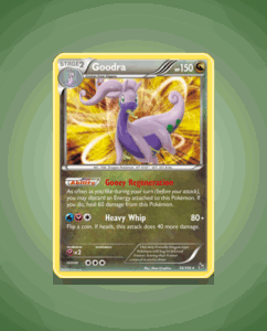 Goodra from the Flashfire set is a Rare Holo card numbered 74 with 150 HP. It features the ability Gooey Regeneration and the attack Heavy Whip. This card offers a solid combination of durability and offensive capability.