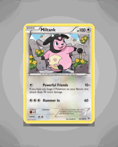 Miltank from the Flashfire set is an uncommon card with 100 HP. This sturdy Pokémon features the attack Hammer In, offering a straightforward approach in battle. Its solid design fits well within the set’s dynamic lineup.