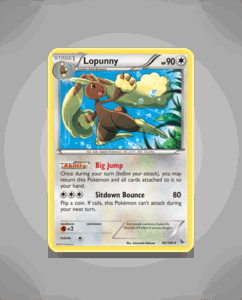 Lopunny from the Flashfire set is a rare card boasting 90 HP. It features the ability Big Jump and a dynamic attack called Sitdown Bounce. This card is numbered 85 in the set.