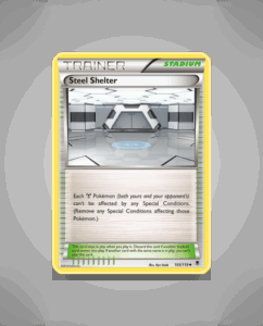 Steel Shelter is an uncommon card from the Phantom Forces set, numbered 105. Its design reflects the set’s thematic elements, making it a notable piece for collectors. Though it lacks attacks or abilities, its presence adds depth to the Phantom Forces collection.
