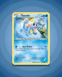Totodile from the Phantom Forces set is a common card numbered 15 with 60 HP. This lively Pokémon features the attack Fury Strikes, adding dynamic action to gameplay. Its straightforward design makes it a notable pick for collectors seeking classic charm.