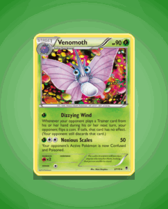 Venomoth from the Phantom Forces set is a rare card boasting 90 HP. Its sole attack, Noxious Scales, adds a strategic edge to gameplay. Numbered 2 in the set, this card offers a distinctive addition for collectors.