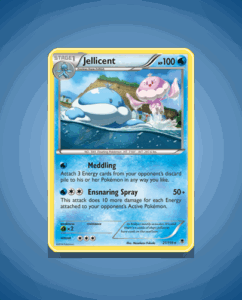 Jellicent from the Phantom Forces set is a rare card with 100 HP. It features the distinctive attack Ensnaring Spray, adding strategic depth to gameplay. This card is numbered 21 in the set, making it a notable addition for collectors.