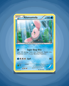 Alomomola from the Phantom Forces set is a common card numbered 22. It features a sturdy 100 HP and a single attack called Surf. This card offers a straightforward, reliable option for players seeking solid water-type support.