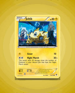 Joltik from the Phantom Forces set is a common card numbered 26 with 30 HP. This small Pokémon features the Night March attack, offering an energetic option for battle strategies. Its modest stats make it a straightforward choice for collectors and players alike.