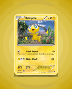 Helioptile from the Phantom Forces set is a Common card numbered 29. This lively Pokémon has 50 HP and features the attack Static Shock. Its straightforward design makes it a practical addition to any collection.