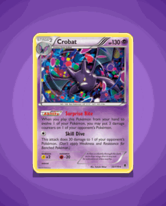 Crobat from the Phantom Forces set is a rare card boasting 130 HP. It features the intriguing ability Surprise Bite and the dynamic attack Skill Dive. This card holds a distinctive place as number 33 in its set.