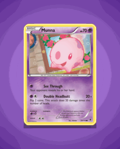 Munna from the Phantom Forces set is a common card with 70 HP. This card features the attack Double Headbutt, offering straightforward offensive capability. Its simple design makes it an accessible choice for collectors and players alike.