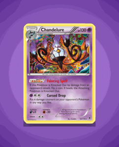 Chandelure from the Phantom Forces set is a Rare Holo card with 130 HP. It features the intriguing ability Fainting Spell and a striking attack called Cursed Drop. This card stands out with its unique combination of power and strategy.